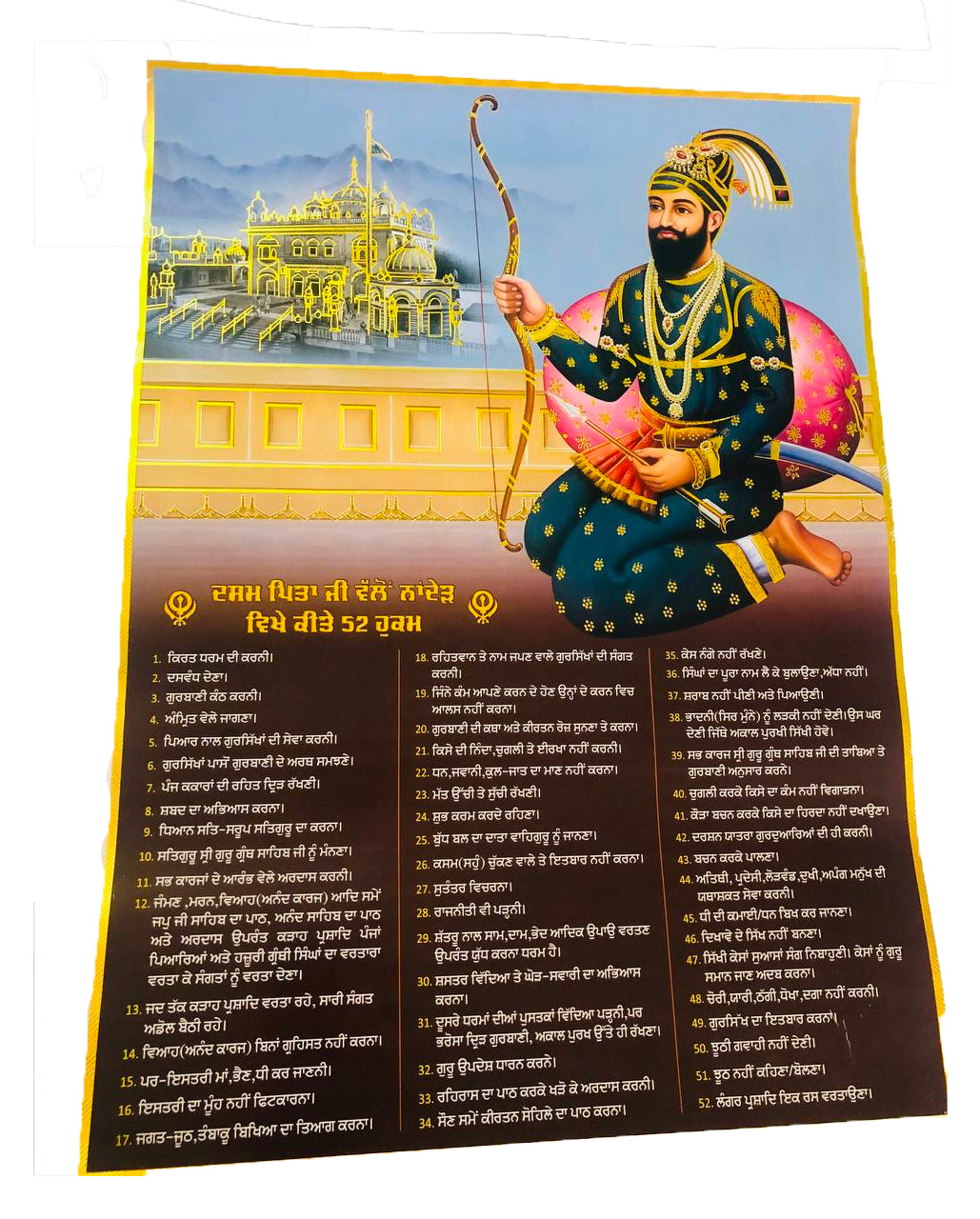 Poster 52 Hukams Sahib Sri Guru Gobind Singh Ji 23"x18"